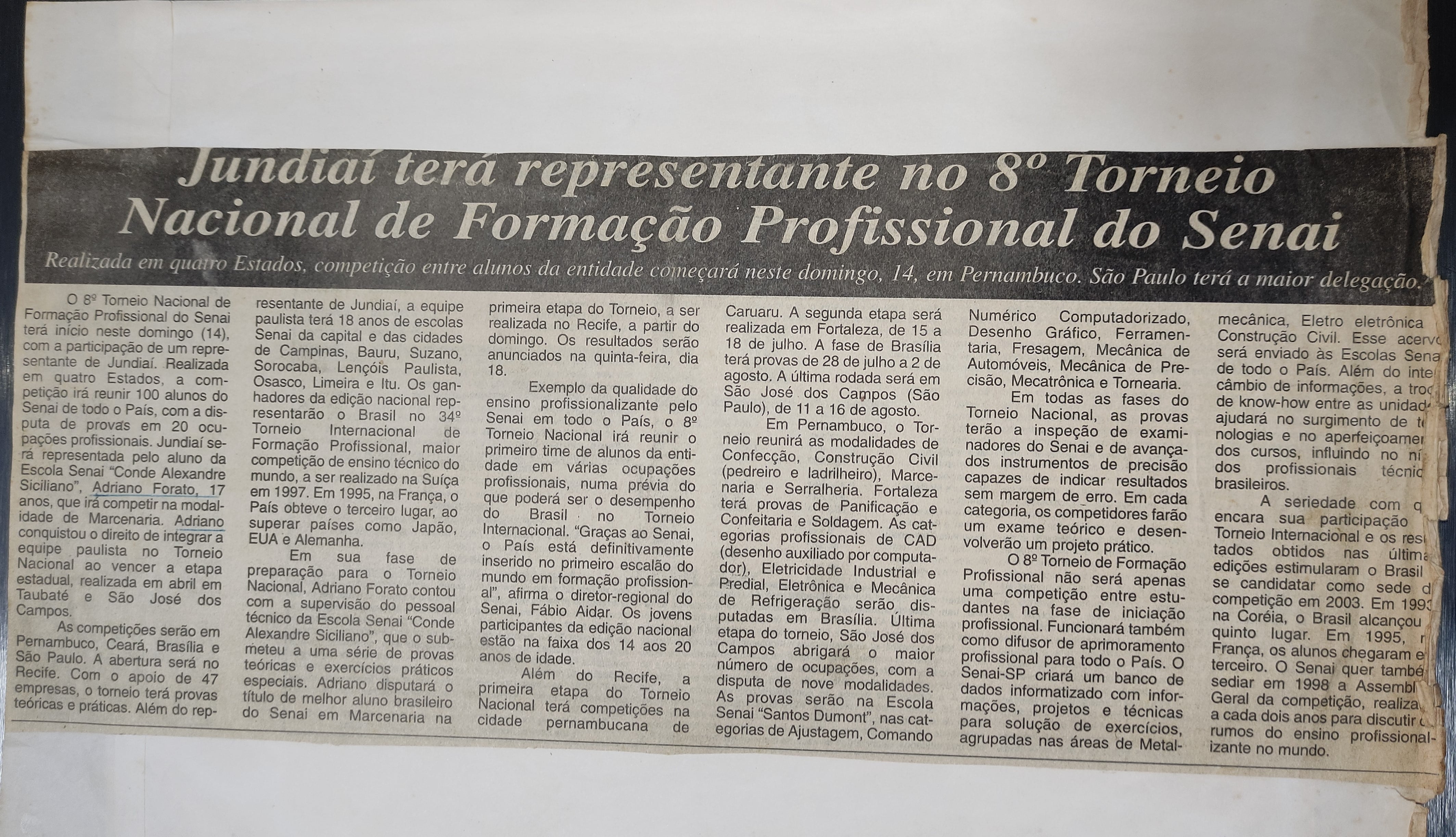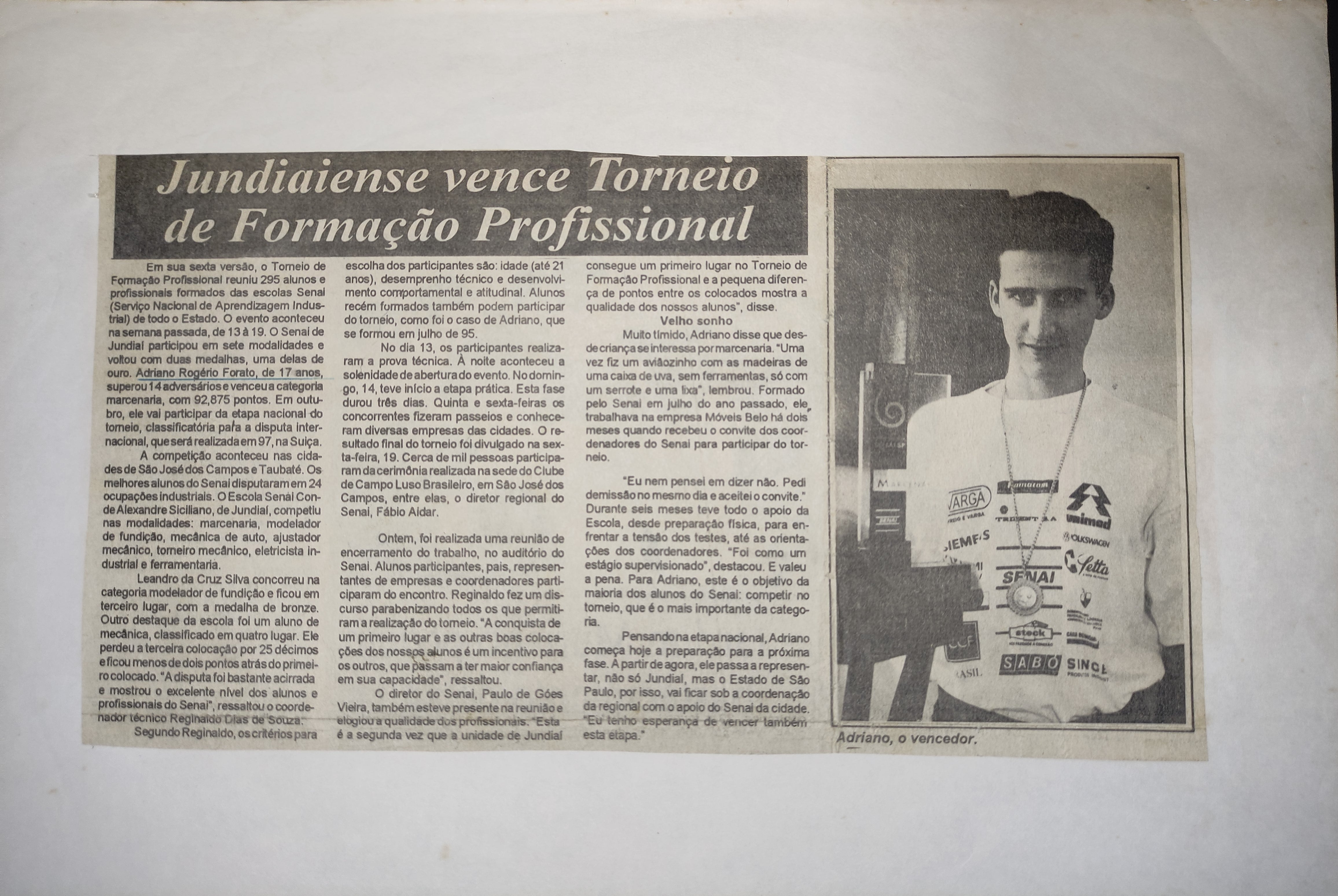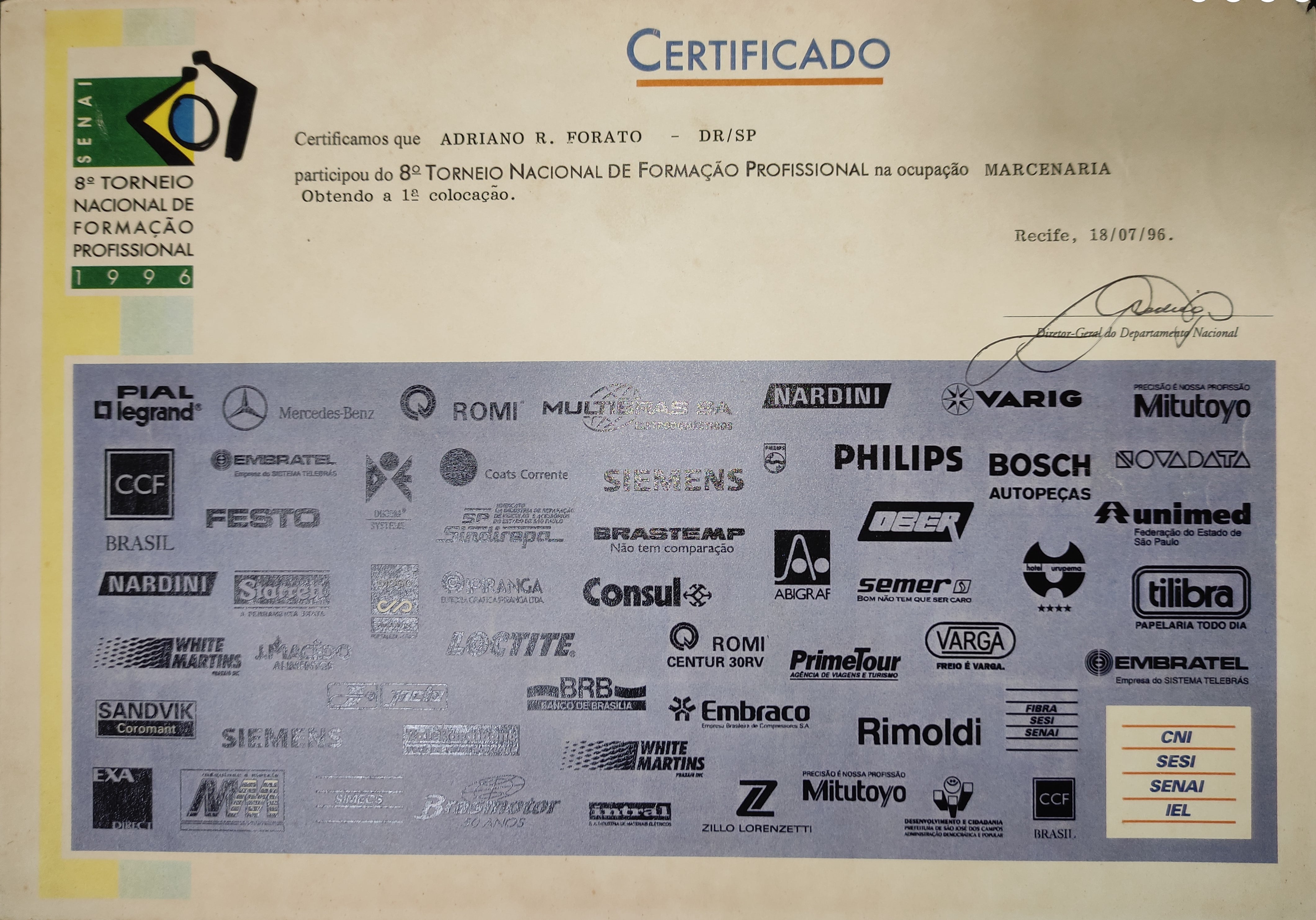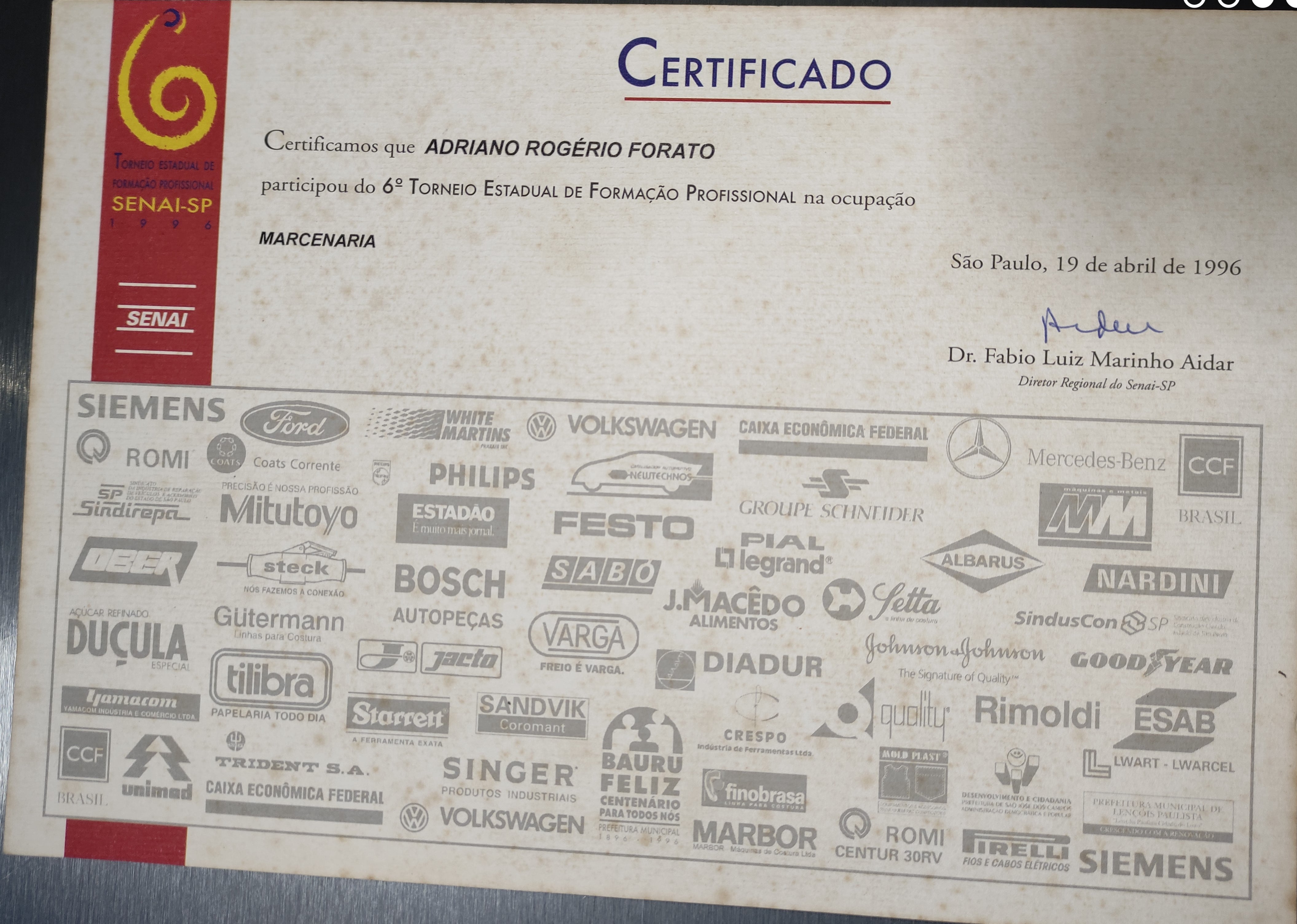 Fiz Senai na cidade de Jundiaí, na àrea de marcenaria e sempre fui um aluno dedicado. Com isso, fui chamado para participar do torneio que o Senai realiza entre alunos. Com muito estudo e dedicação, ganhei em primeiro lugar no sexto torneio estadual de formação profissional e em primeiro lugar também no oitavo torneio nacional de formação profissional.